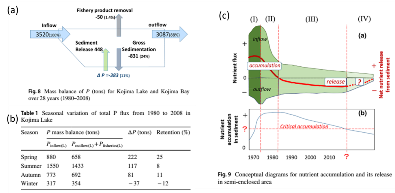 (a) 28年见近海磷收支模型,(b)沉积物对磷蓄积释放的季节性特征,(c) 近海沉积物临界蓄积量对富营养化治理响应的4个过程