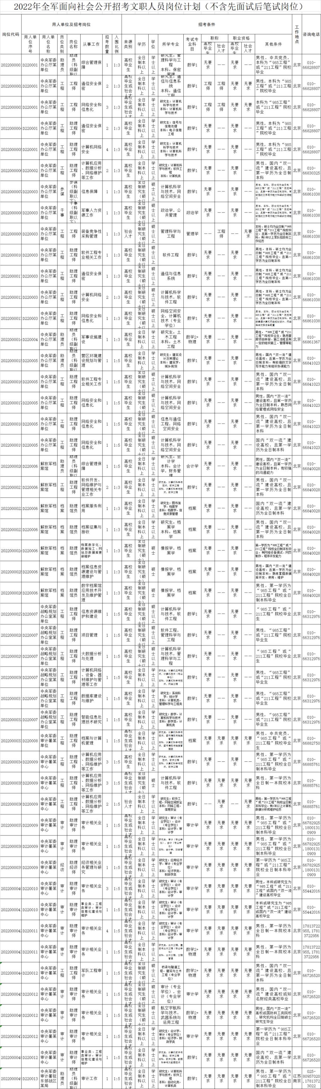 全军统一考试于2022年1月9日进行,内容包括公共科目和1门相应专业科目,主要考核报考人员的综合素质和专业基础。公共科目和专业科目考试大纲,可登录军队人才网浏览和下载。其中,专业科目考试大纲分为哲学、经济学、法学、教育学、文学、外国语言文学、历史学、理工学、农学、医学、图书档案学、艺术学、管理学等13类45个专业。对专业科目考试大纲没有覆盖的小语种和少数民族语言专业岗位,专业科目笔试按照相应语种语言本科教育教学大纲命题。