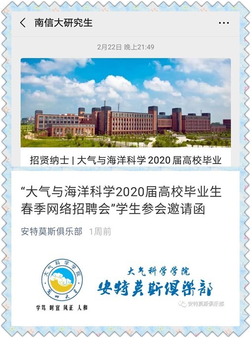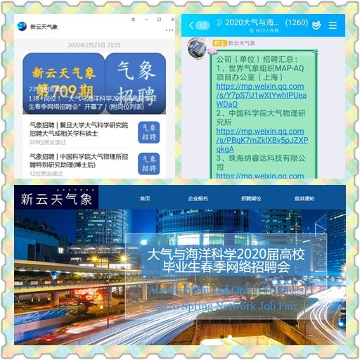 2月23日起,根据中央、广东省和学校对毕业生就业工作的相关要求,新云天气象工作室举办的“大气与海洋科学2020届高校毕业生春季网络招聘会”通过互联网正式开幕,为2020春季全国首个大气与海洋类招聘会。工作室全体同学及校内外导师克服部分企事业单位尚未复工等困难,成功邀请到复旦大学大气研究院、中科院大气所、南信大气象科技研究院、粤港澳大湾区气象监测预警预报中心、象辑科技、中科三清等12家知名企事业单位进入通过“新云天气象”微信公众号、QQ群和网站(//www.xytqx.com/)搭建的虚拟展位,开展“空中宣讲”“在线面试”等招聘活动,提供高质量就业岗位近200个,涵盖大气科学、海洋科学等独播库tv