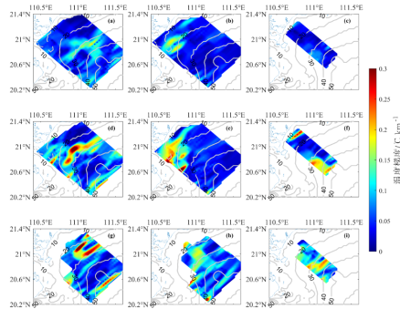 基于现场高分辨率观测和再分析数据,给出了粤西陆架海温盐锋的三维结构、季节变化和影响机制。结果显示,春、夏季20 m等深线以浅存在沿岸高温海水与离岸低温海水辐聚而成锋面,锋面强度随着深度的增加减小,覆盖范围向岸收缩(如图4)。20 m以深水域锋面随深度增加而增强并向岸偏移。相关性和信息流分析发现,海表面风应力旋度和沿岸风是影响粤西陆架海表温度锋面的重要因素。该温度锋存在年际变化,PDO负位相时的 La Nina 年锋面强度出现极大值,而PDO正位相时的 El Nino 年则对应极小值。