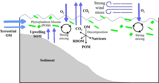 我们此前通过现场调查发现,有机物的分解(碳源)是台风后沿海水域的主要过程,这与先前研究中的浮游植物生长(碳汇)相反。然而,台风诱导有机物分解的特征和机制以及分解主要分解颗粒有机物还是溶解有机物的问题仍不清楚。为了解决这些问题,对台风“Merbok”(2017)前后在南海北部进行物理化学参数和多种同位素的调查。台风过后,由于台风引起水体剧烈的扰动,近岸区域叶绿素a含量下降(25%),而上涌底部/沉积有机物(SOM)增加。相比之下,离岸的叶绿素a含量增加(增加了3倍),主要由于离岸区域水深,水体较为稳定。然而,然而,近岸和离岸都出现了正的表观耗氧量,这表明无论台风后是否出现浮游植物爆发,有机物的降解都是主要的生物地球化学过程。近岸区域分解的有机物主要来自SOM,而离岸主要来自原位新鲜的浮游植物。有机物的降解占近岸总耗氧量的66%,而在离岸占36%(主要是颗粒有机物为主,占25%)。本研究表明,台风引起的有机物降解可能以颗粒有机物为主,不利于有机物在沉积物中的储存。这意味着沉积物作为碳汇的能力将在全球变暖(台风事件增加)的情况下减弱。该研究发表于《Journal of