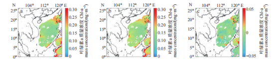图6 南海500 m以深海域叶绿素a质量浓度空间分布。(a)高氮沉降通量年份叶绿素a质量浓度空间分布;(b)低氮沉降通量年份海表叶绿素a质量浓度空间分布;(c)二者叶绿素a质量浓度之差。