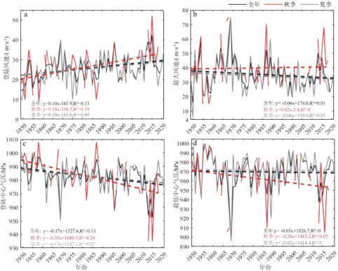 图7 登陆广东台风特征年际变化。(a)登陆近中心最大风速;(b)平均中心最大风速;(c)登陆中心气压;(d)最低中心气压。全年(黑色)、夏季(灰色),秋季(红色),虚线表示线性趋势