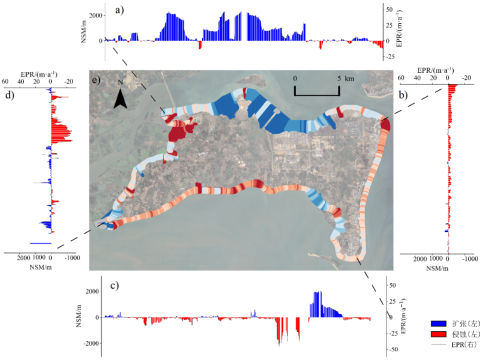 图33. 1973—2023年间东海岛 (e) 及其北岸 (a)、东岸 (b)、南岸 (c)、西岸 (d) 净海岸线移动和海岸线移动率分布