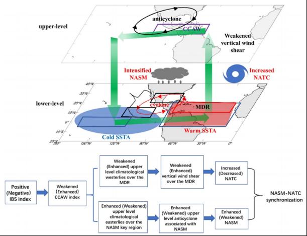 图27.热带太平洋-大西洋跨洋盆海温偶极子影响北美夏季风-北大西洋热带气旋年际变异同步性的物理过程示意图。图中的蓝色框代表定义跨洋盆海温梯度(IBS)指数的关键海域,黑色框表示用于定义北美夏季风强度指数的关键区域,红色框代表北大西洋热带气旋主要发展区(MDR),紫色框代表用于定义跨越美洲中部的纬向风(CCAW)指数的关键区域。热带大西洋的暖海温异常(红色阴影)和热带太平洋的冷海温异常(蓝色阴影)的差异形成正的跨洋盆海温梯度(IBS)指数,呈现出热带太平洋-大西洋跨洋盆海温偶极子结构特征。