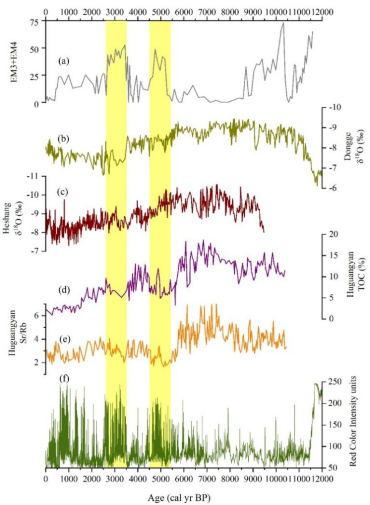 亚高山雨养型泥炭地主要依靠大气沉降获取营养物质,沉积速率稳定能够很好的记录大气环境变化,是研究物质来源和古气候变化的优质载体。为了更好的了解局地区域泥炭地沉积物的来源和粒度代用指标对气候变化的响应,本研究对湖南城步十万古田亚高山泥炭地(SWGT)(图45)的稀土元素(REE)、Sr–Nd同位素进行了沉积物物源的分析,并且使用粒度端元分析模型分别重建了EASM的演化和极端降雨事件。Sr–Nd同位素和REE的分析结果表明,局地区域的风化产物是该地全新世以来的主要沉积物来源。通过粒度端元模型分析识别出4个粒度端元: EM2为中等粒径的化学风化产物,与区域内其它气候记录比较发现其对气候变化较为敏感,能够用来重建EASM的演化,其中,在11600-9000 cal yr BP期间EASM相对较弱,9000 cal yr BP以后EASM呈现逐渐减弱的变化趋势;EM3+EM4是泥炭沉积物中最粗的组分,是在极端气候事件下通过强烈的地表径流带入到泥炭地中的粗颗粒物,在5400–4500 cal yr BP和3500–2600 cal yr BP期间,EM3+EM4的高值阶段与已经报道的长江流域的古洪水事件所发生的时间较为一致,其主要受到弱季风事件和强ENSO活动的影响(图46)。该项研究对于更好的理解局地区域的沉积物来源和重建极端降雨事件起到了重要作用。