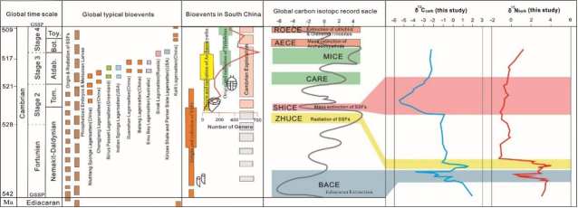 利用碳同位素识别出华南寒武纪三期碳同位素偏移事件,即BACE,ZHUCE和SHICE事件,分别对应全岩氮同位素的负偏、正偏和负偏,暗示水体反硝化作用程度的变化。推测海水厌氧水体的扩大和收缩以及营养循环的改变可能直接影响了后生动物群落的演化过程。另外,对寒武纪早期地层进行高分率的元素地球化学和矿物学研究,重点对暗色泥岩沉积期的风化作用、生产力变化、底水氧化还原环境和海水封闭条件进行了相关评价,并识别出可区域性对比的上升流和热液事件。相关成果以曹瀚升老师为通讯作者于2024发表在《Geological Magazine》。