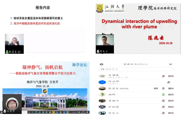 举行了第十期海学论坛,这次论坛有幸邀请到了中国科学院海洋研究所研究员、国家优青张国良老师以及汕头大学海洋科学研究院的陈兆云教授,同时和我院的方杏芹教授都作了十分精彩报告。论坛由陈法锦院长主持,采用线上进行的方式,学院及学校部分师生参会人数近百余人。