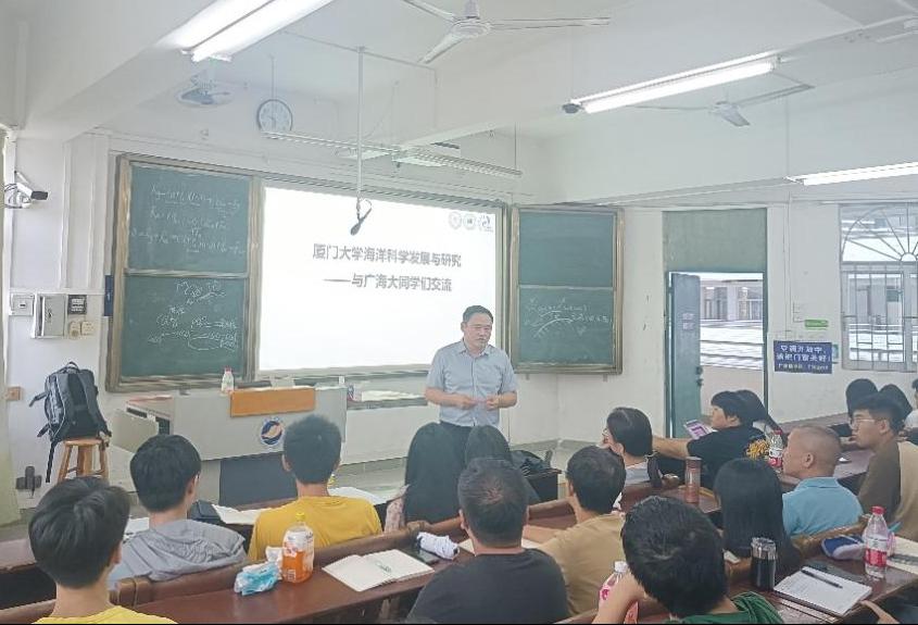 9月25日,蔡明刚教授旁听了学院副院长陈法锦教授主讲的本科生课程《海洋生物地球化学》,接着,蔡教授结合课程教学大纲内容,做了主题授课。在课堂上,蔡教授从地球系统科学的角度介绍了海洋环境污染问题的本质,深化同学们对海洋生物地球化学的认识,增强了同学们利用地球科学系统的思维去研究海洋问题的能力。最后,还与同学们积极互动,引导大家深入思考。通过蔡教授的指导,我院学生对海洋生物地球化学有了更深入的理解和认识。