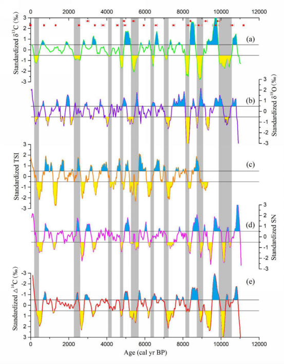 我院海洋地质团队成员黄超经过反复的条件实验,建立了适合泥炭岩芯样品的α-纤维素提取方法,基于在北疆阿勒泰山获取的长达7.5m的泥炭岩芯,开展α-纤维素碳同位素研究,并结合在泥炭地海拔梯度上开展为期2年的现代观测结果(图1),论证了阿勒泰泥炭α-纤维素碳同位素是一个比较可靠的古温度指标,重建了该研究区域过去11500年以来夏季温度的演化历史(Rao and Huang, 2019)。并且发现该区域夏季温度还呈现千年尺度和百年尺度的波动变化特征。千年尺度上,阿勒泰泥炭α-纤维素碳同位素清晰的记录了数次明显的气候突变事件,与北大西洋浮冰碎屑事件具有较好的对应关系(图2),说明北大西洋的温度变化可通过西风环流对中亚干旱区的温度产生一定的影响。百年尺度上,将阿勒泰泥炭α-纤维素碳同位素记录、太阳活动指标(TSI、SN以及△14C)同时进行标准化处理,剔除长期变化趋势,获得百年尺度的变化信息,并进行对比分析。结果发现,阿勒泰地区的夏季温度的异常变化刚好与减弱的太阳活动吻合(图3),说明百年尺度上阿勒泰地区的夏季温度变化主要受到太阳活动的影响。为了进一步确定阿勒泰地区夏季温度与太阳活动之间的关系,我们对阿勒泰泥炭记录与太阳活动指标SN和△14C分别进行时间序列的滤波分析和交叉谱分析,结果发现存在数个显著的百年太阳活动周期。这些对比分析进一步表明,阿勒泰地区百年尺度的温度异常变化受控于太阳活动的影响。